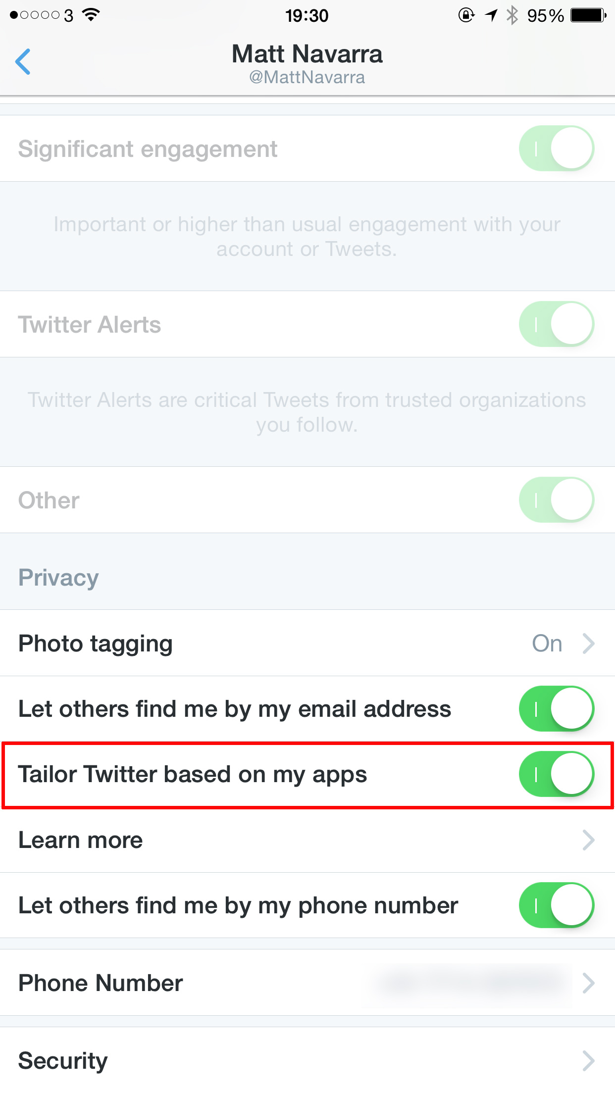 Navigate to the Me tab and tap the gear icon. From the pop-up, choose Settings. Then choose the account you would like to remove from ad-based targeted ads. Scroll down to the Privacy section and turn off Tailor Twitter based on my apps.